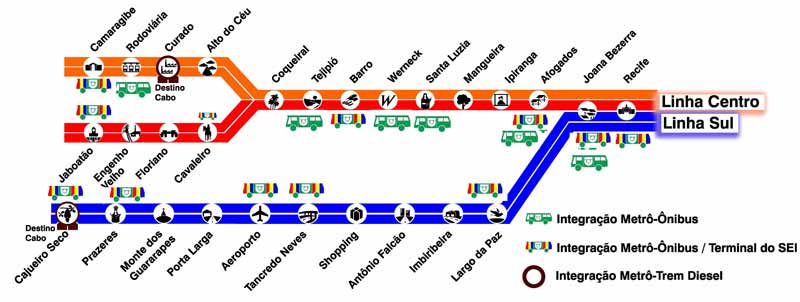 Já a linha SUL (na cor azul) tem seu destino na estação CAJUEIRO SECO onde possui um terminal integrado com onibus.